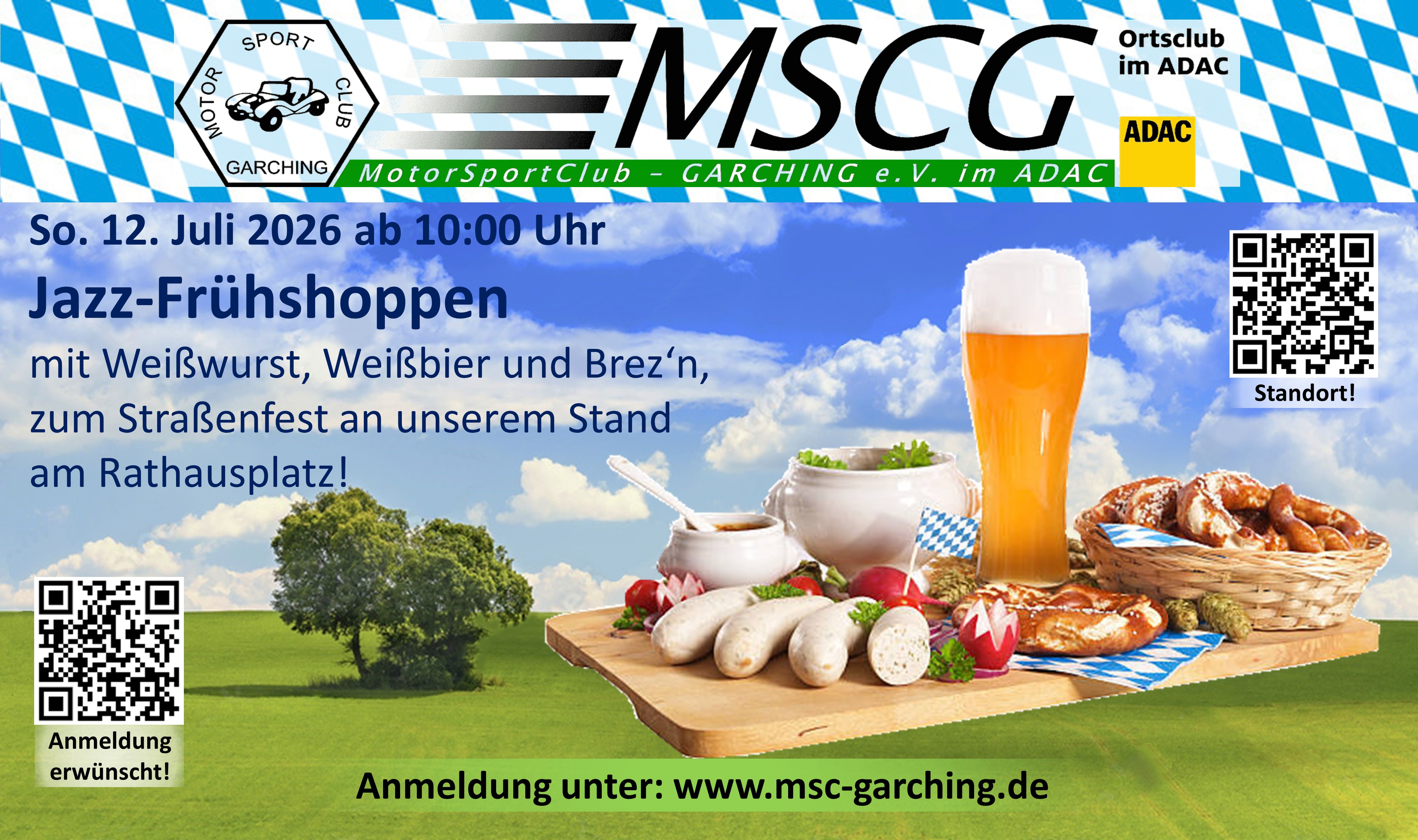 Wir veranstalten zum Straßenfest am 12. Juli 2026 um 10:00 Uhr unseren 4ten Jazz-Frühschoppen mit Weißwurst, Brez'n und Weißbier. Den Flyer zum Event findet ihr hier.